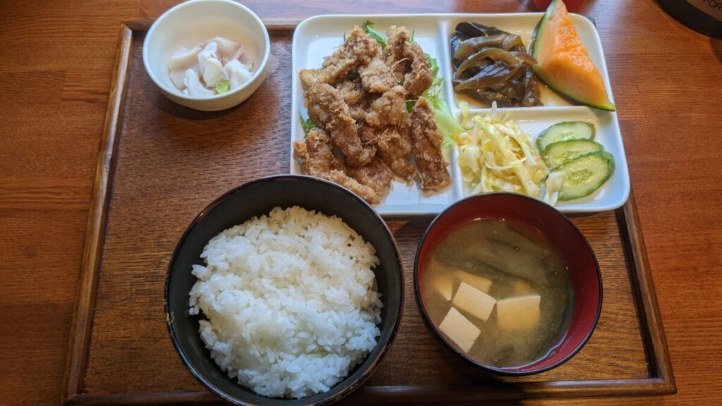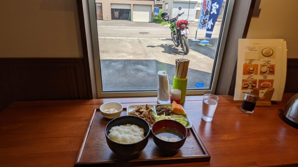 店名の通り、年配のご主人がワンオペでやっている店です。この日のワンプレートランチ「豚の竜田揚げ」は、メロンも付いて650円。ガス釜で炊き上げる蘭越産の米が最高です。ライダーズカフェのようにバイクを眺めながら食事をしました。