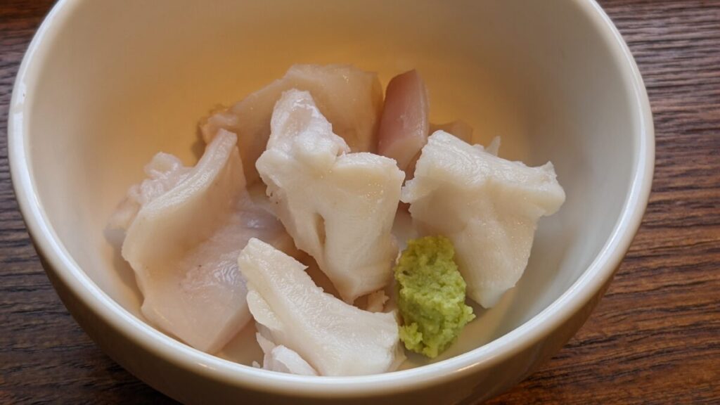 小鉢の刺身は、北海道名物「タコの頭」です。タコ足は人気で本州でも高値が付きますが、頭は不人気のため地産地消されています。店主の思いやりを感じられる料理に満腹になりました。