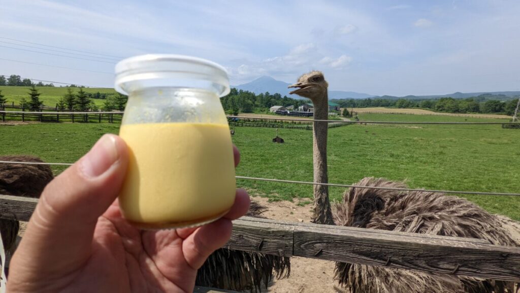 牧場内のショップでは、ダチョウ肉の加工食品や卵を使ったスイーツを販売しています。ダチョウを眺めながら食べるダチョウのタマゴを使ったプリンは最高。あっさりしながらも力強く、大地を踏みしめているような味がしました。