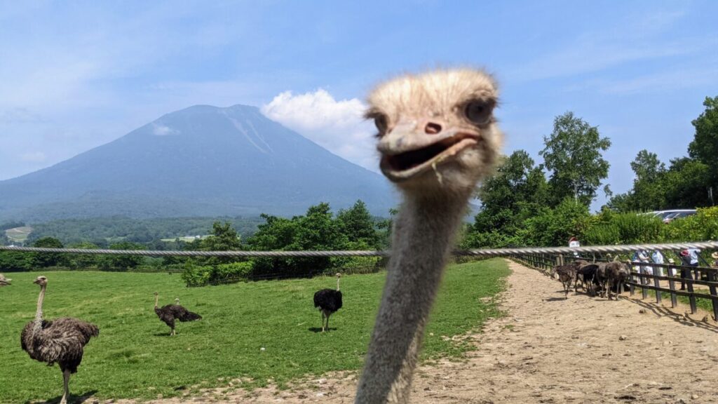 羊蹄山とダチョウがシュール「ニセコ第2有島だちょう牧場」