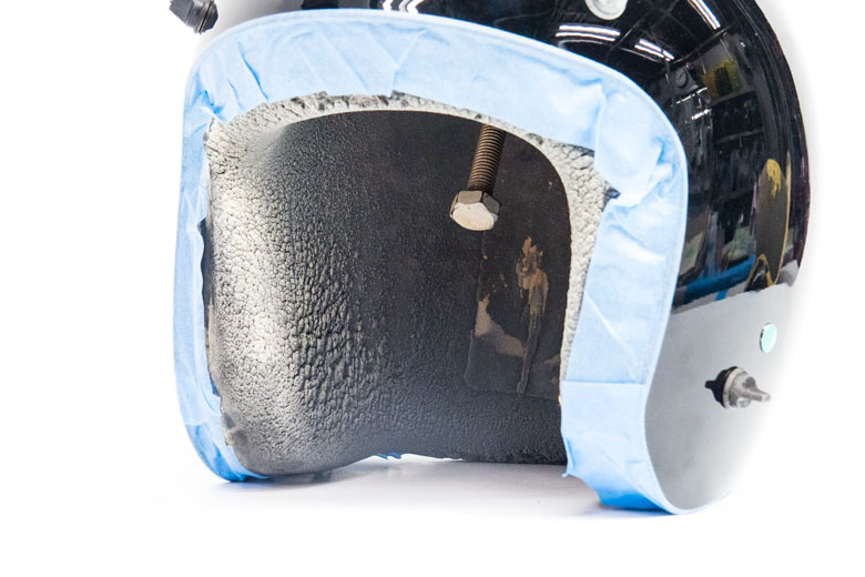 塗装する際にはヘルメット内装やボタン部分など「塗ってはいけない部分」を、マスキングテープで隠す必要がある。塗装の工程でマスキングが占める時間の割合は決して小さくないのである。