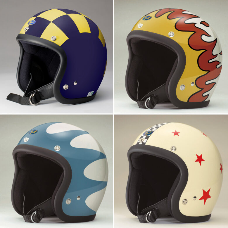 BUCOヘルメットのグラフィックはプレーンタイプに見られる1950年代から、フレークをまぶしたラメラメデザインの1970年代まで幅広いです。愛車のキャラクターに合うヘルメットがきっと見つかることでしょう。