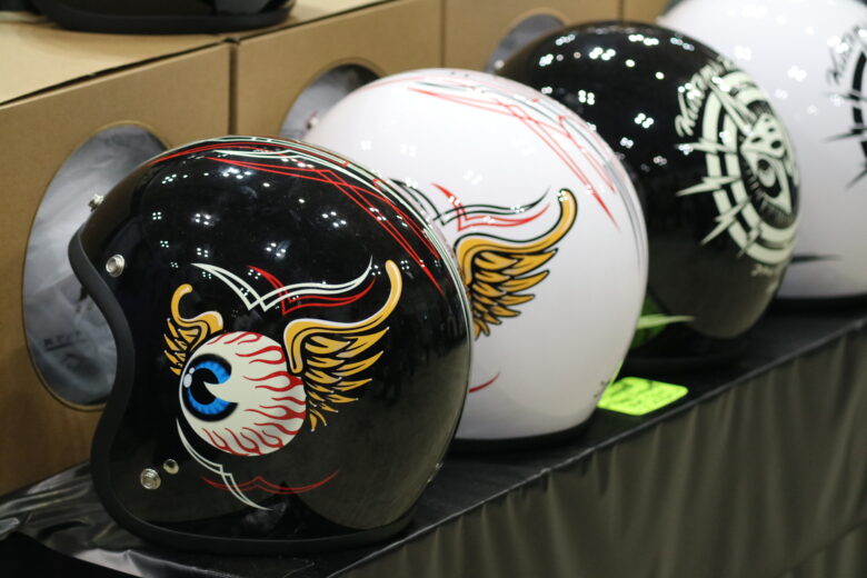 BELLやBUCOのように、古き良きアメリカのモーターカルチャーをインスパイアしたデザインを軸としながら、人気を博したポイントはバリエーションの豊富さ。前述の500-TXをはじめ、ビンテージオフロードの世界観を表現したフルフェイス「トゥーカッター」、そしてジェットヘルメットとの相性抜群のゴーグルまで手がけています。さらにグラフィックも、プレーンにフレークはもちろん、1970年代ハーレーダビッドソンにも用いられていたレインボーデザイン、アメリカンカスタムシーンに多く見られるフレイム(炎)デザインと「カスタムシーンを知る人」ならではのデザインを存分に取り入れています。またヘルメットの縁にあたるトリムも、従来のラバーから金属感を演出したクロームまで揃えるこだわりぶり。
