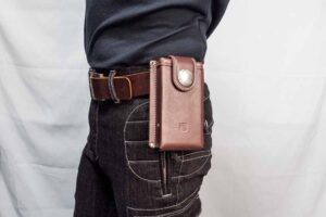 ベルトに固定してメインホックを外してみるとスマートフォン収納部分がパタンと開きます。何度も試作して開く角度は決めたとの事ですが、製品版の角度は30度。実際に使ってみましたが、外側に開くことで取り出しが楽になります。