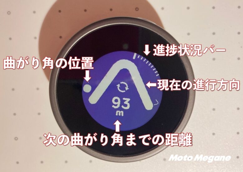 ちなみに矢印と一緒に次の曲がり角までの距離(m)と位置、目的地までの進捗状況をバー表示してくれます。