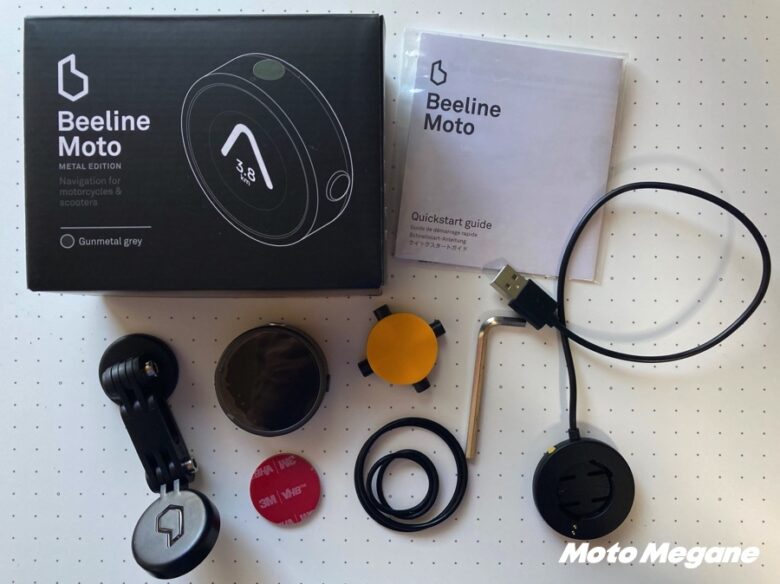 ってことで、BeeLineMotoの美しいパッケージを開封してみたところ、中から出てきたのは本体、充電器、マウント類一式+工具、マニュアル」と至ってシンプルな内容です。