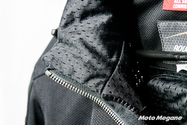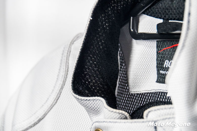 汗をかきやすい襟もとには吸湿速乾性に優れ体表温度を快適に保つクールマックスメッシュが採用されている。