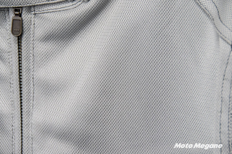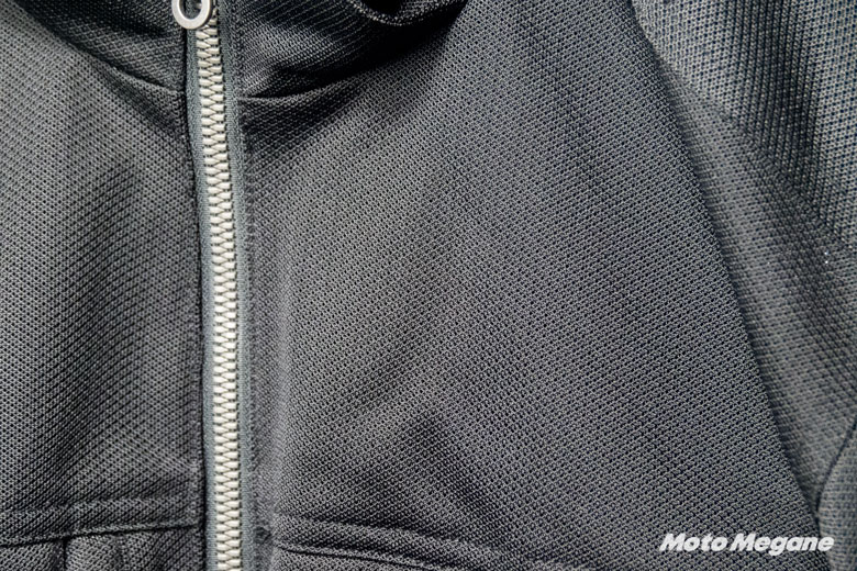 メッシュ部分をしっかりと見てみると、メッシュの編み方がジャケットとは異なることに気が付いた。横糸が入っていて、通気性や強度を持たせつつ、透け感を調整している。