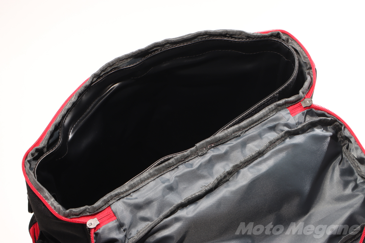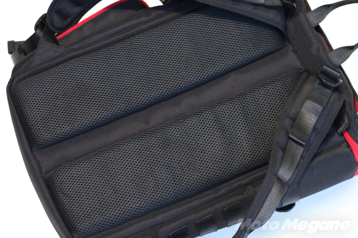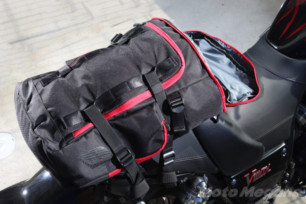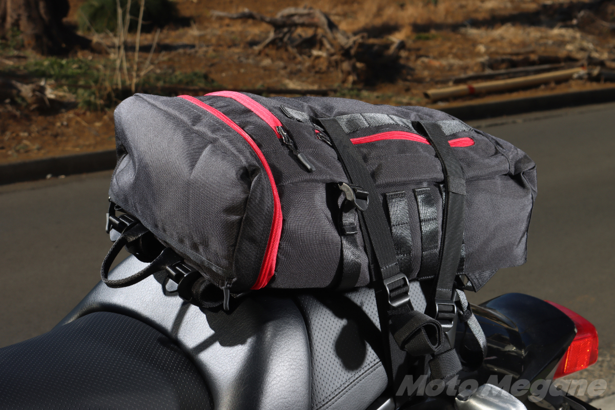 大型のバックパックはシートにバッグが乗ってしまって不安定になることがあるが、インナーウォータープルーフバックパックFB-856はサイズ感も良く、ライディングの邪魔になるようなことは無かった。