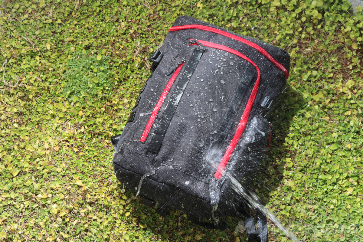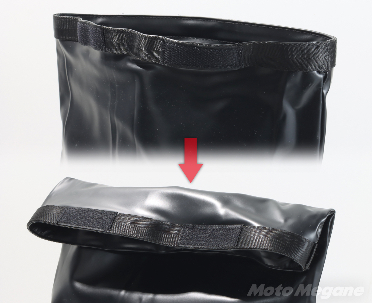 雨天走行をする際は、こうした使い方をすることでターポリンバッグに匹敵する防水性能を得ることができるのだ!