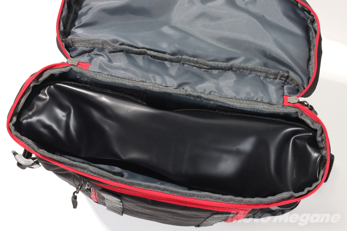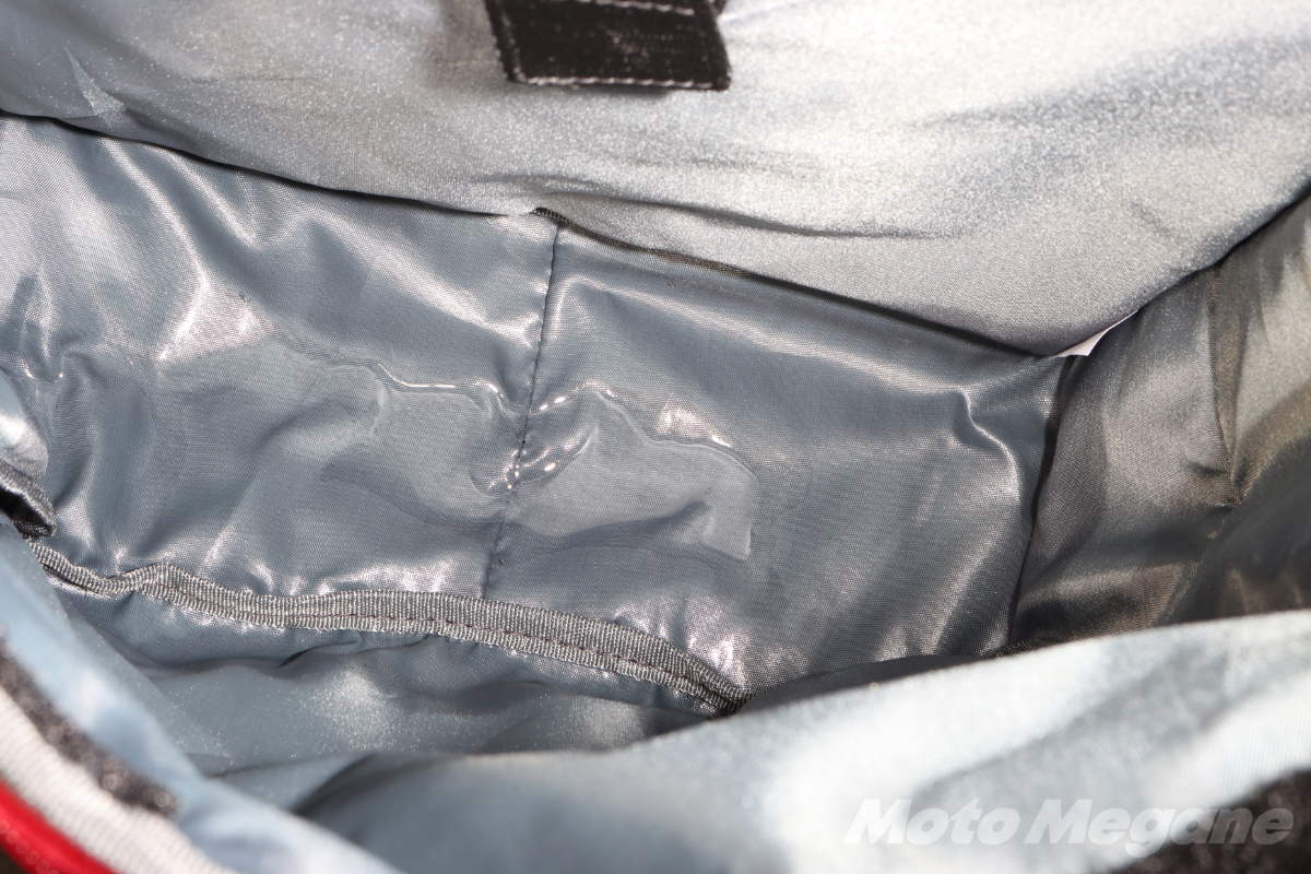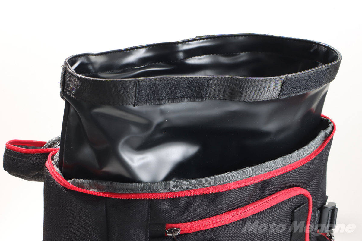 FB-856の最大の特徴は防水インナーバッグが内蔵されている点だ。防水インナーは専用品なのでバッグの内寸に合ったジャストサイズ。
