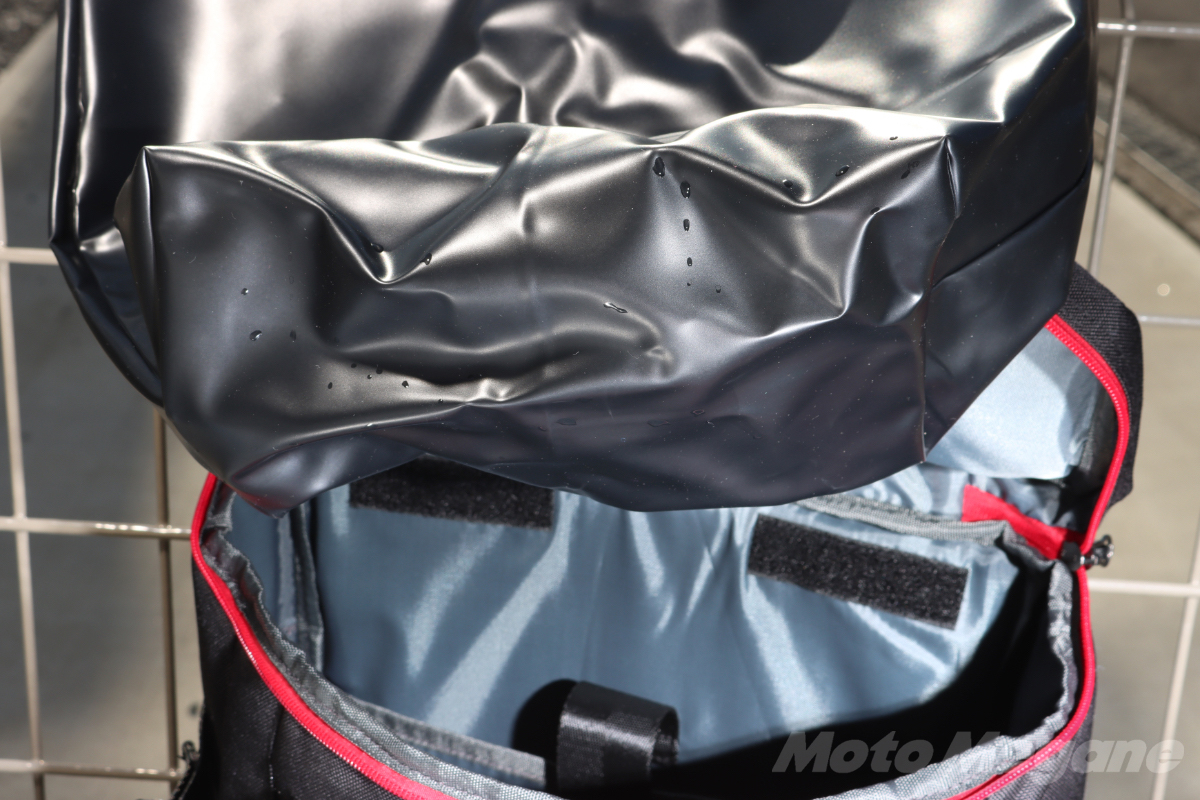 実際に雨天走行する場合は、防水インナーバッグの上部から浸水のおそれがある。