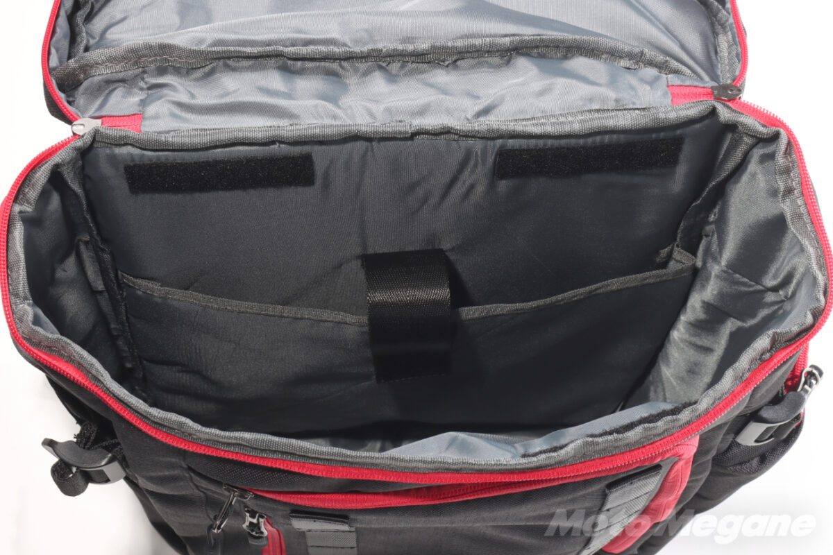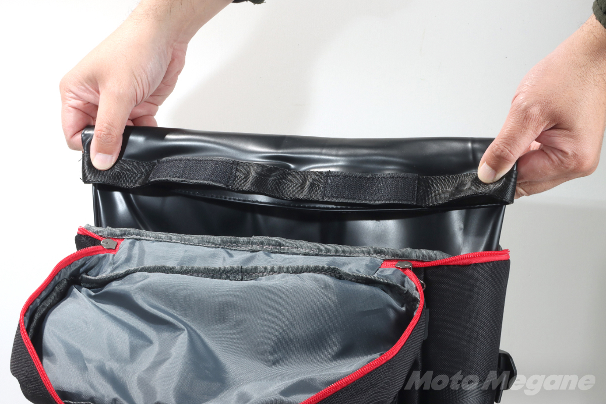 防水インナーバッグの縁部分は全体的に面ファスナーで固定されるので、隙間に誤って物が入ったりすることがないし、荷物の出し入れのたびに防水インナーバッグがずれることもない。