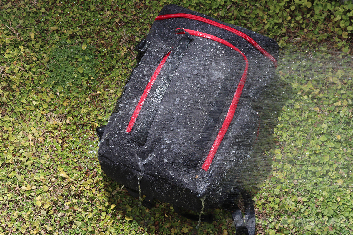インナーウォータープルーフバックパックFB-856の防水性をチェックするため、ホースの水をたっぷりかけてみた。