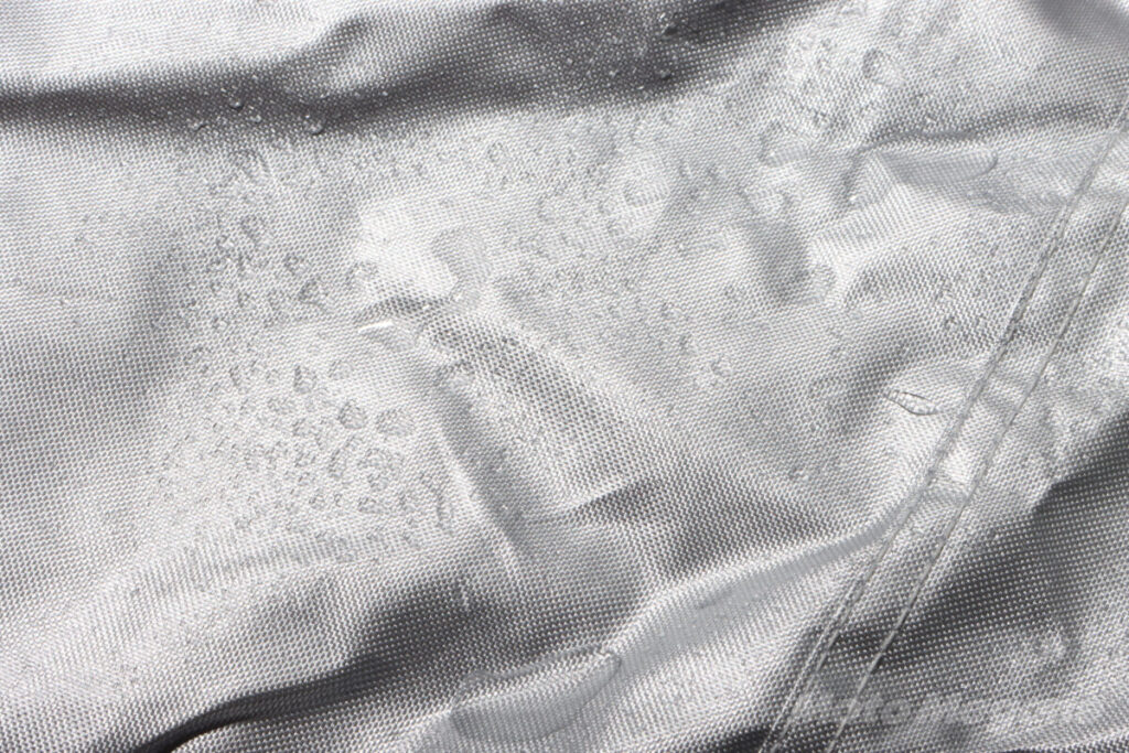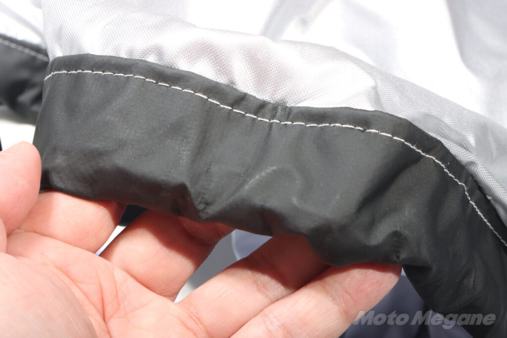 カバーの生地は300デニールのポリエステルにアクリルシルバーコーティングが施されたもので、さらに撥水加工されている。
