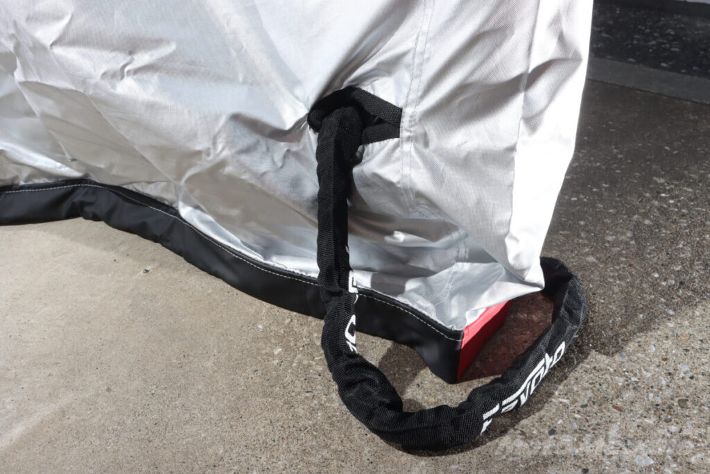 もちろん、カバー後方の裾にもチェーンが入っているので、同じようにカバーを引っ張って離すだけで、車体を覆ってくれる。