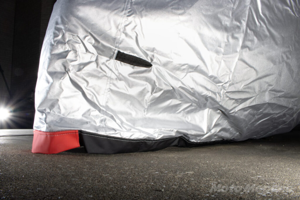 最大の特徴はカバーの裾部分全周にチェーンを内蔵していること。これによって、バイクカバーの裾が重力の力で自然に地面に落ちるので、カバーをかける際にあちこち移動して屈んだり引っ張ったりする必要が無いのである。