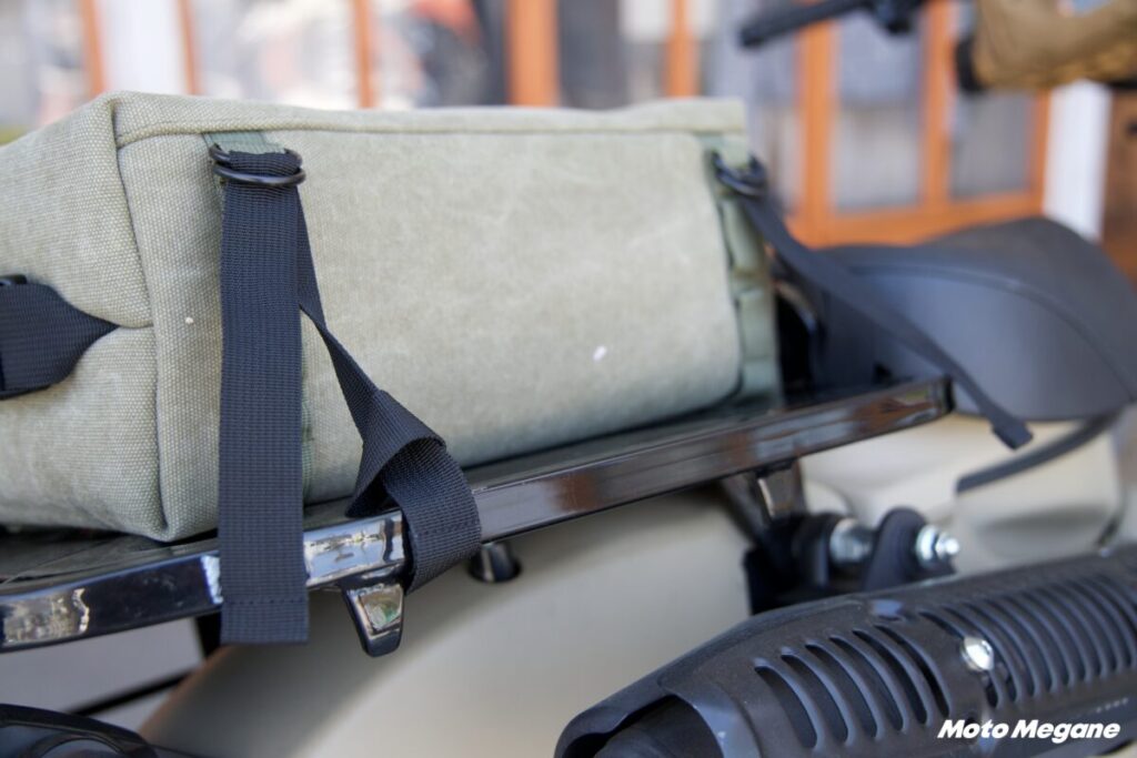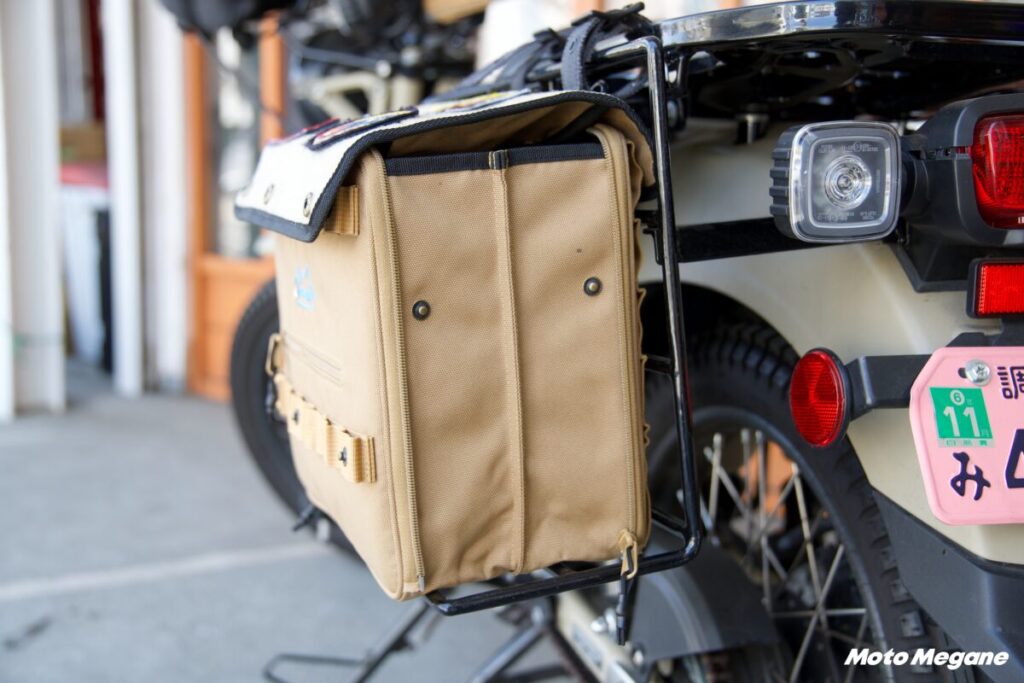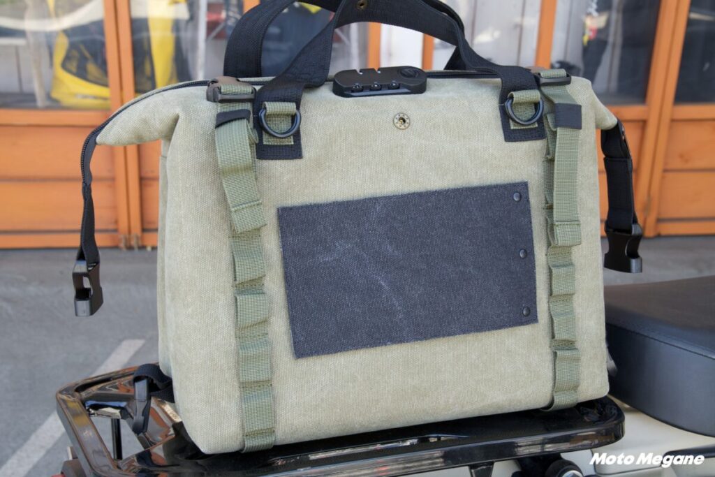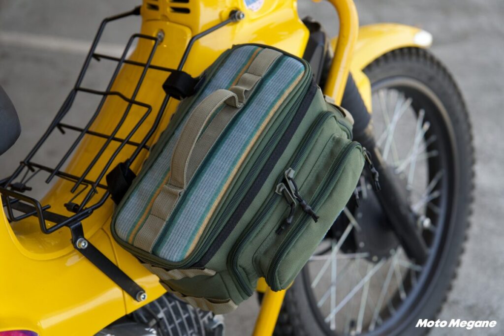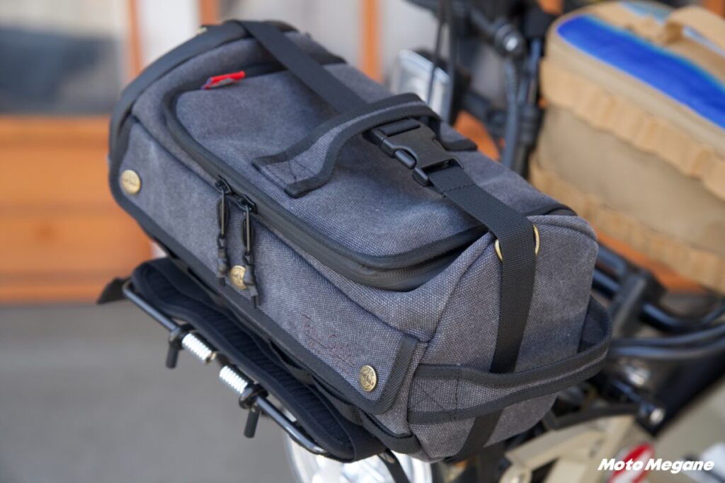 バッグの形状がスクエアなので空間を有効に使えるのもポイント。バッグの背面&底面にはナイロン製のモールがぐるっと縫い付けられ、ハンターカブやクロスカブなどのキャリアにも四方をガッチリと付属のベルトで固定できる。