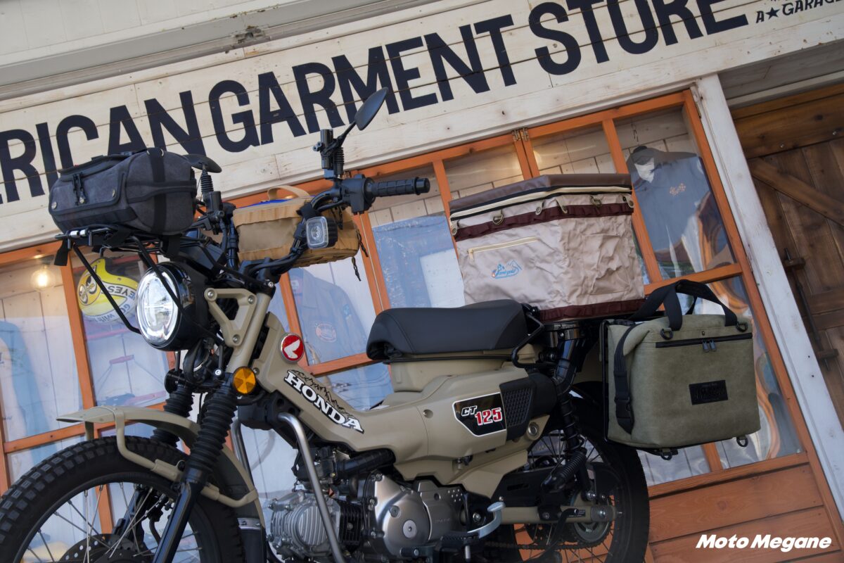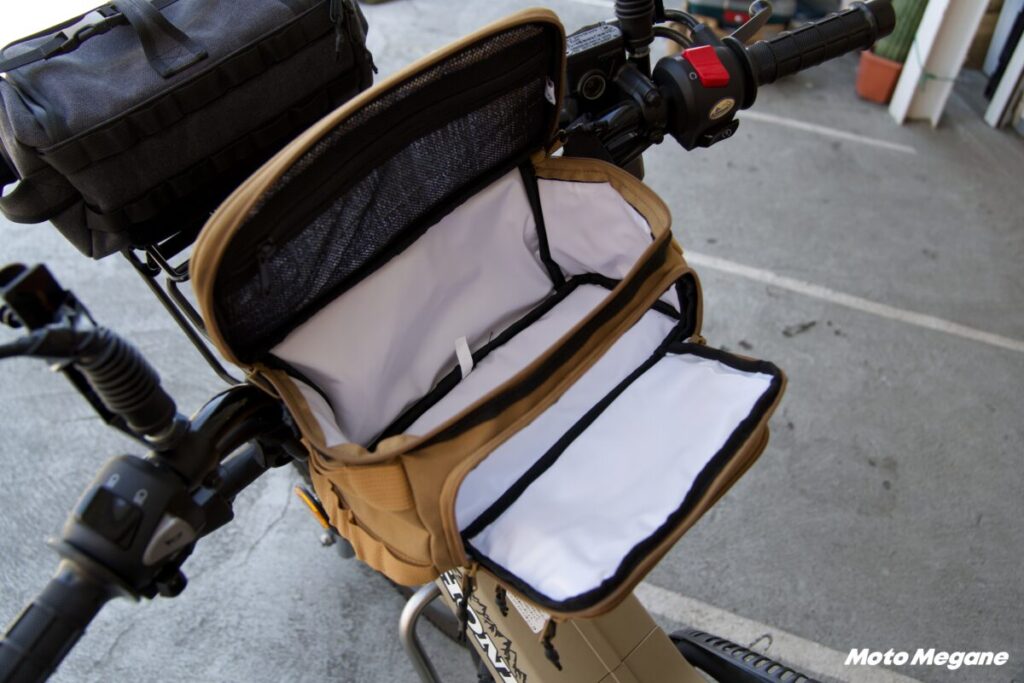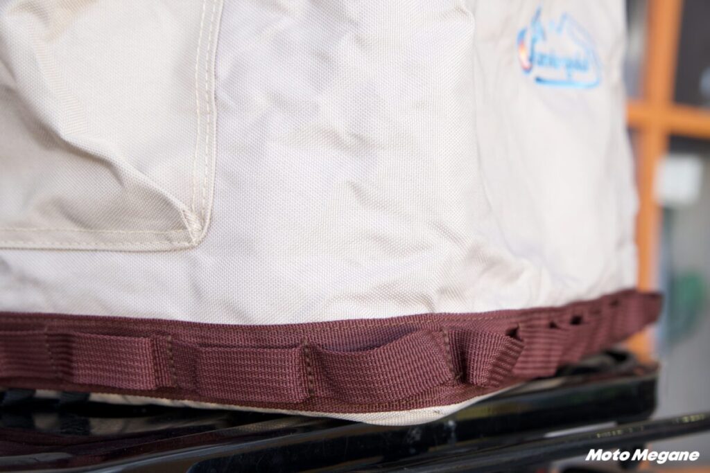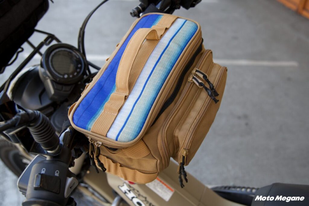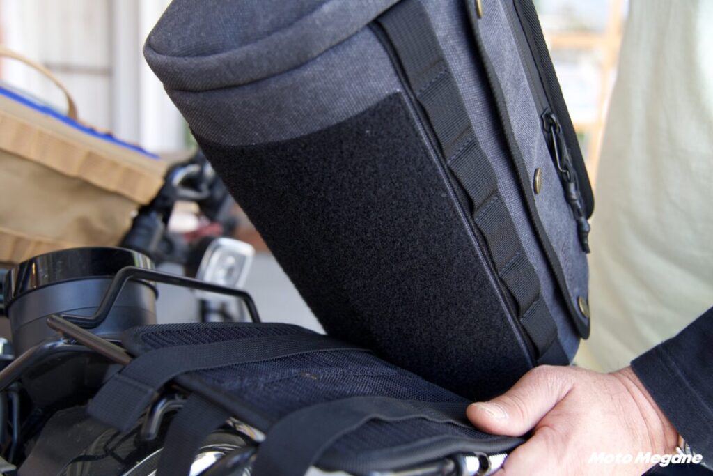 バッグの形状がスクエアなので空間を有効に使えるのもポイント。バッグの背面&底面にはナイロン製のモールがぐるっと縫い付けられ、ハンターカブやクロスカブなどのキャリアにも四方をガッチリと付属のベルトで固定できる。