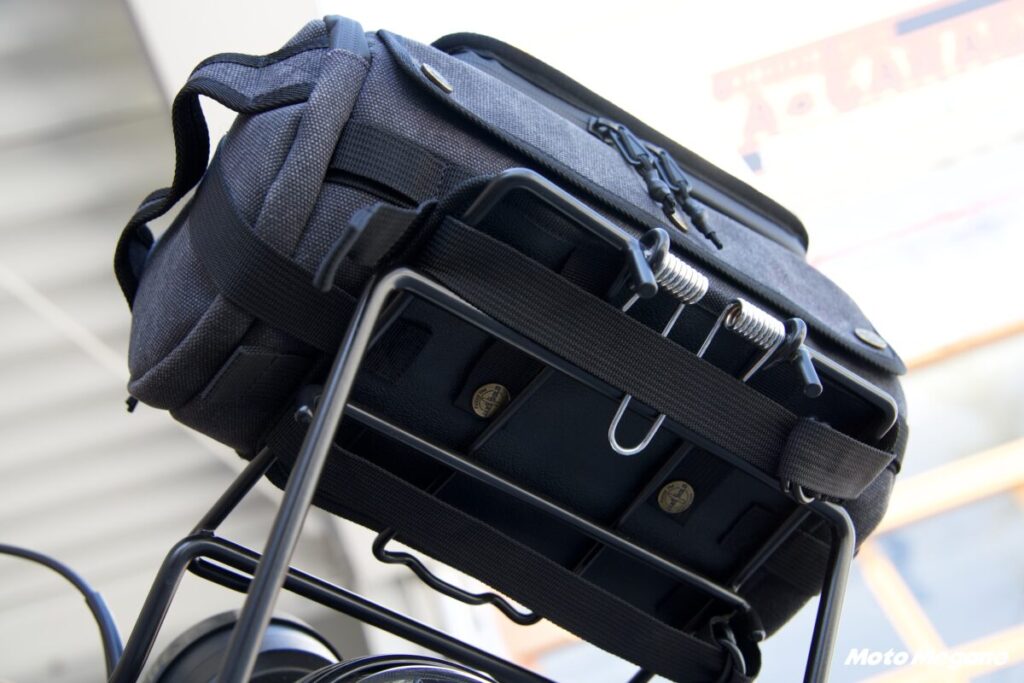 バッグの取り付けは、車体に台座を取り付けて、面ファスナー&ベルトで固定するだけ。