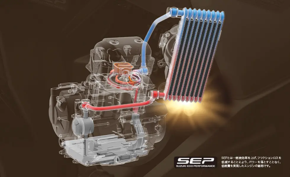 VストロームSXに搭載される油冷単気筒エンジンは、2020年に登場したジクサー250/SF250と同じ。エンジンオイルの潤滑用経路とは別に、シリンダーヘッドまわりを循環する冷却用経路を持つSOCS(Suzuki Oil Cooling System)を採用。無駄を配した構造はフリクションロスの低減が徹底され、軽量化と燃焼効率の向上も実現。最高出力はVストローム250の24ps/8000rpmより高い26.5ps/9300rpm、最大トルクも2.2kgf・m/6500rpmに対し2.26kgf・m/7300rpmと、わずかではあるが上回るスペックとなっている。