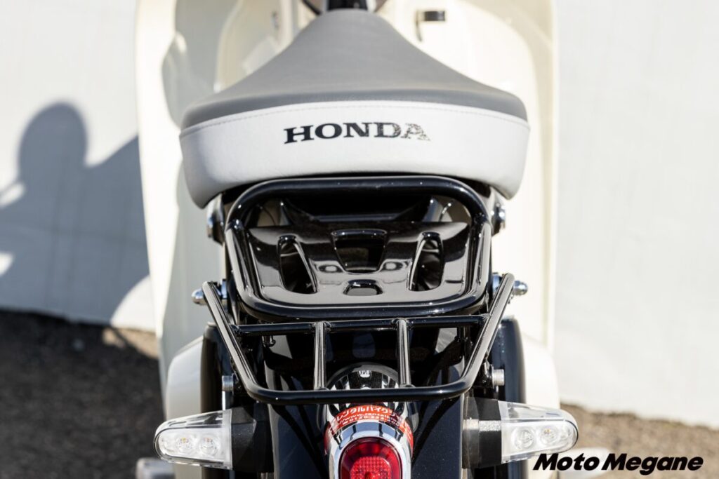 スーパーカブC125に最初から付いている純正リアキャリアは、スマートなボディに合わせて非常にコンパクトな作り。