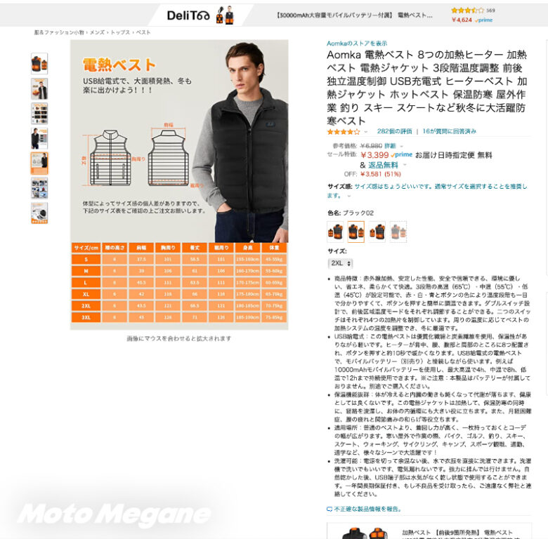 ア●ゾンで電熱ベストを検索し、価格の安い順でソートしてみると、バリバリ2000円台からあるのですが、さすがに最安は電熱部分が少ないようですし、感電とか発火とかが頭にチラつき少し日和った結果、それでも3000円台前半のベストを選んだのです。