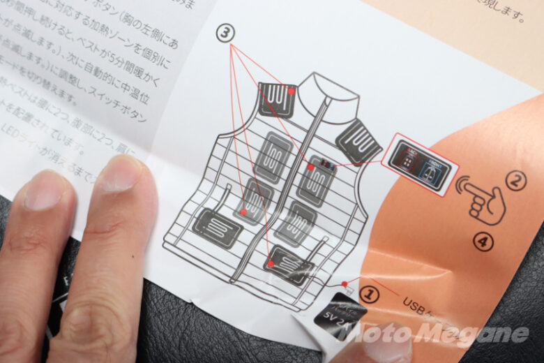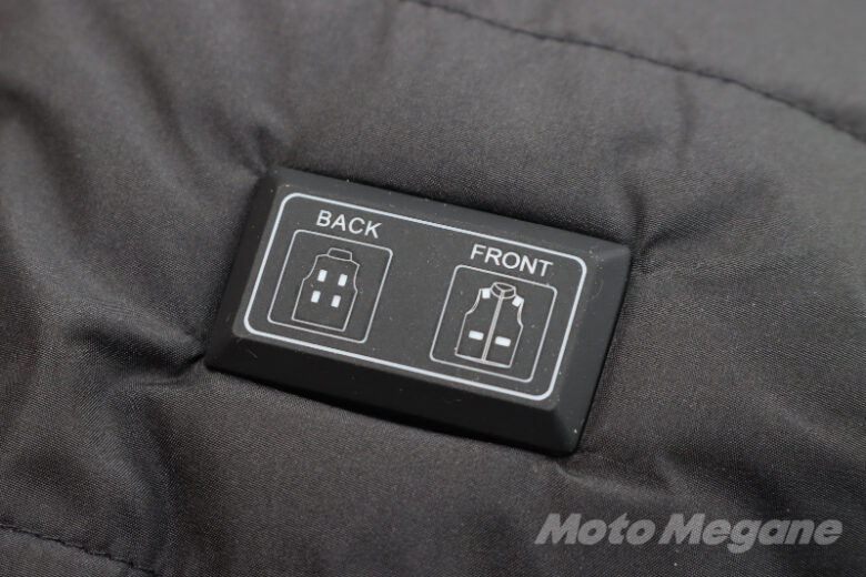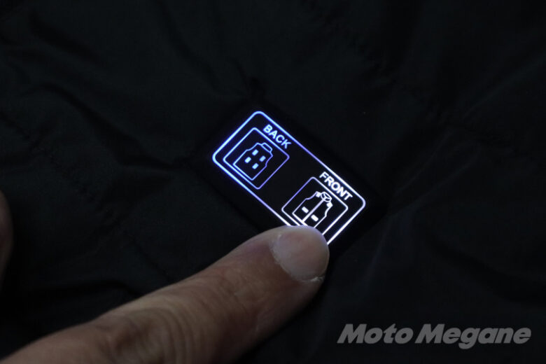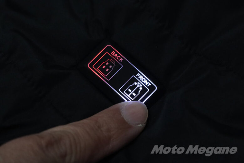 胸の部分にボタンがあり、なんでそうなのかわからないのですが、体の前面と背面の電熱を別々に温度調節やオンオフができる構造になっています。焚き火に当たっているときに背中だけ寒いとか?