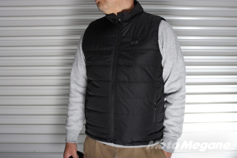 早速着てみると、小さな電熱部からイメージした以上にしっかり暖かい! しかも部分的に暖かいというよりは、ちゃんとベストの胴体部分が満遍なく暖かいのです!