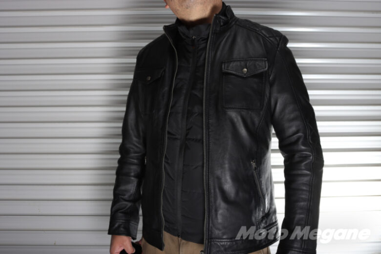 同じようにバイクジャケットの下に着てみると、ミドルレイヤーを省けば難なく着られるし、ミドルレイヤーがあっても行けちゃう範囲。息が苦しいなんてこともないので、これは実用できそうです。