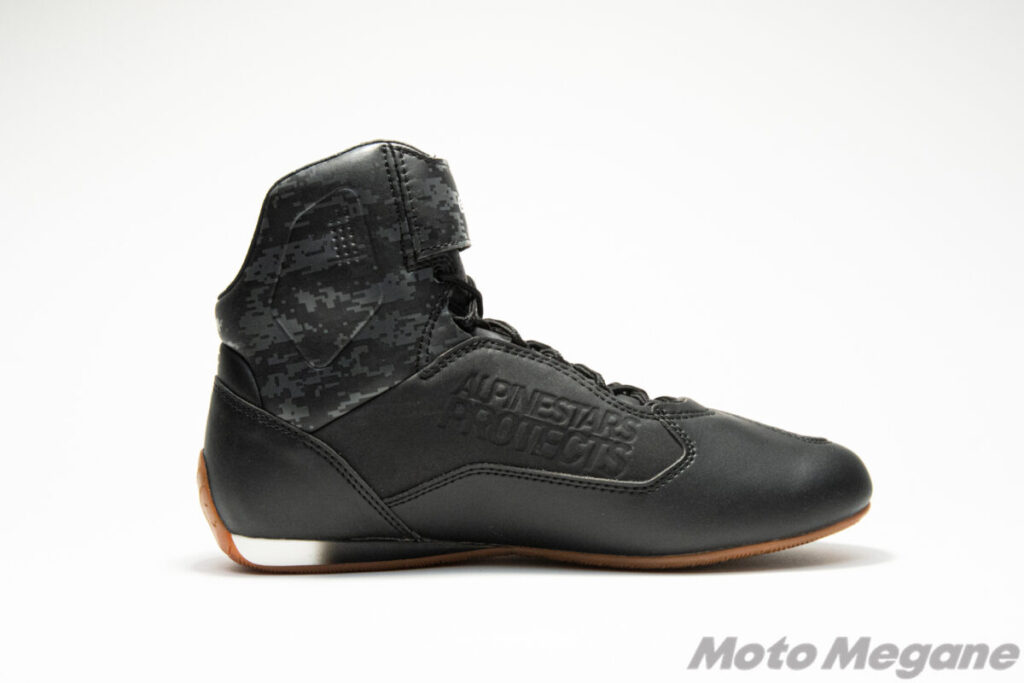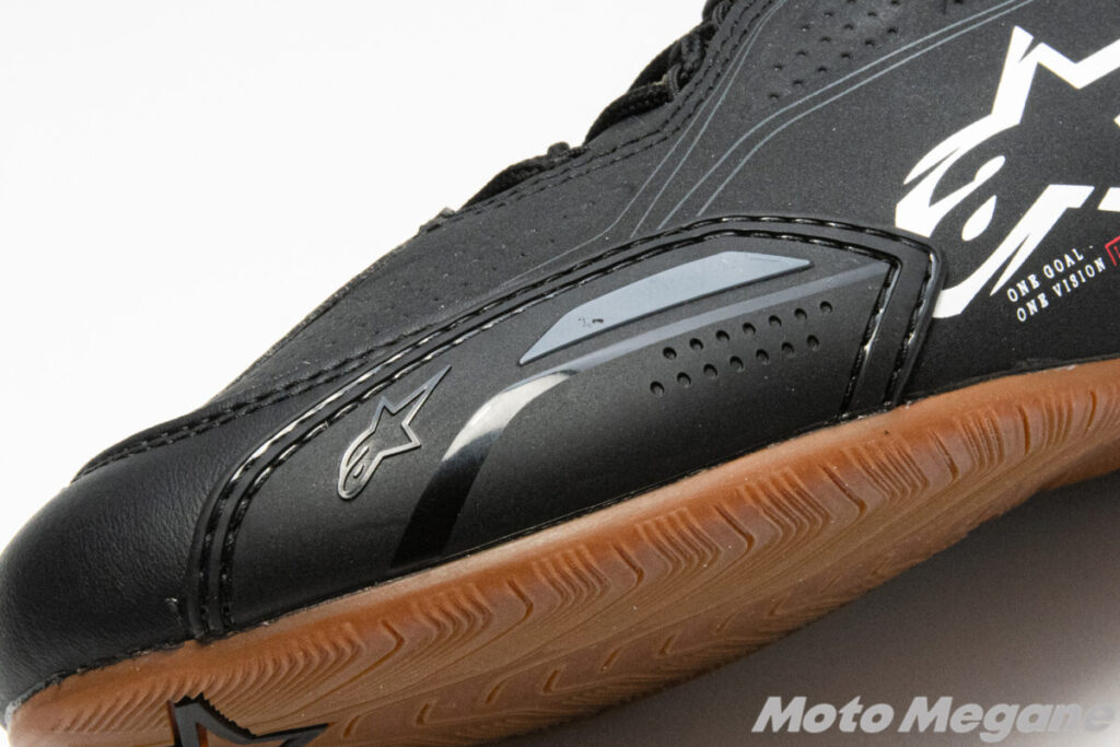 トゥから足首までシンプルなシルエットを見せるFASTER-S SHOE。外側にはシンプルなロゴを、内側にはALPINESTARS PROTECTSの型押しロゴを配置。ラバー製のソールは踵(かかと)の部分までそり返るように配置されています。シャープなアウトラインは、四輪用のドライビングシューズのようにも見えるほど。しかし、そこはバイク用とあって、各部のプロテクション機能も充実しているのです。