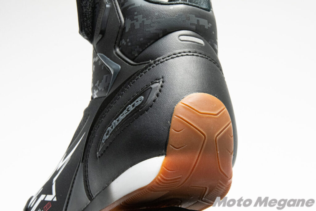 さらにラバー製のソールはシンプルなパターンながらステップ上でも滑りづらく、バイクを降りて歩く時も柔らかな履き心地を実現しています。踵の後ろまで回り込むように配置されたソールも特徴のひとつです。ヒールカウンターのサイドにはTPR製のalpinestarsロゴを配置。こちらも万が一の際の保護性能を高める重要なパーツのひとつです。