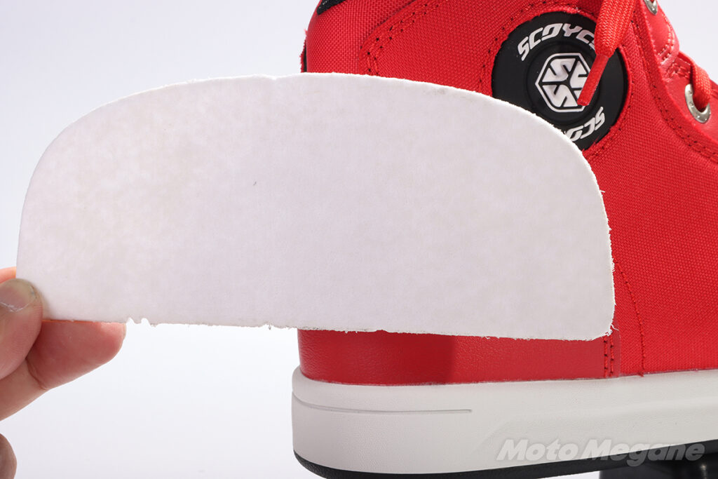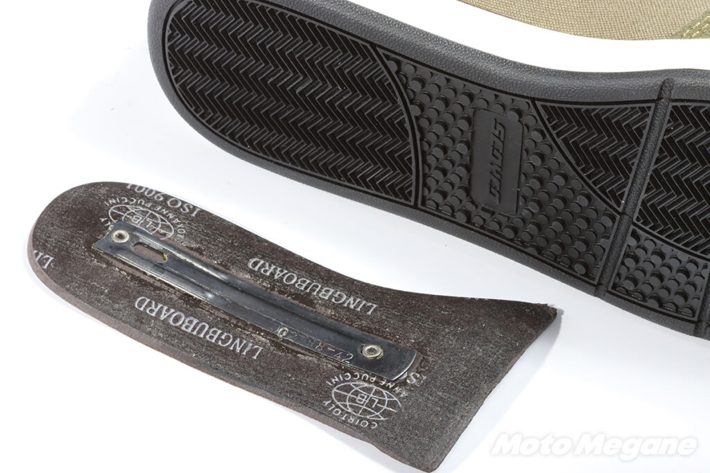スコイコのライディングシューズは、踵から土踏まずにかけてスチールプレートと樹脂プロテクターを内蔵している。