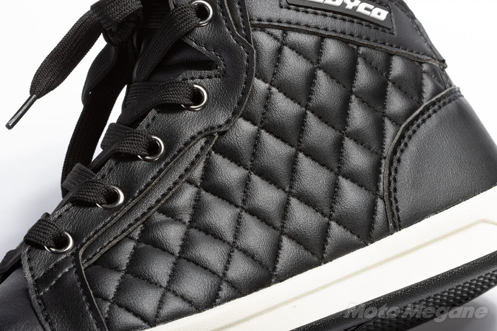 サイドから踵周りまでのダイヤ型のキルティング素材を採用し、シックな中に上質なデザイン性を感じさせる。