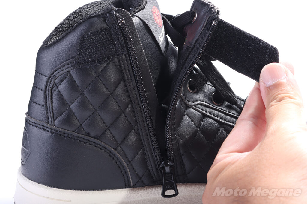 サイドジッパーが足首からソール付近まで大きく開くので脱ぎ履きは非常に楽だ。ツーリング先でお座敷席で食事するときも躊躇なく脱げるのは非常に気楽!