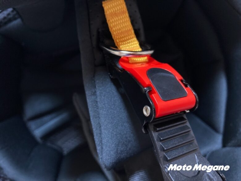 これが地味にありがた〜いポイントなのですが、FLXの顎紐には「Dリング」が付いているので、ヘルメットロッカーに引っ掛けることが出来ます!