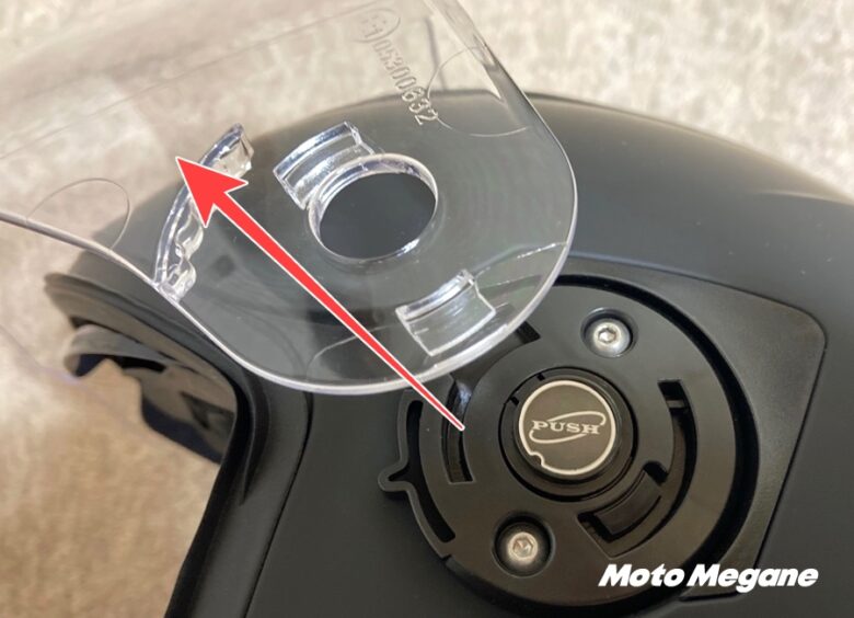 再びシールドを装着する際は、留め具にシールドの出っ張りを合わせた上で、今度は斜め下に押しながらはめ込ます。