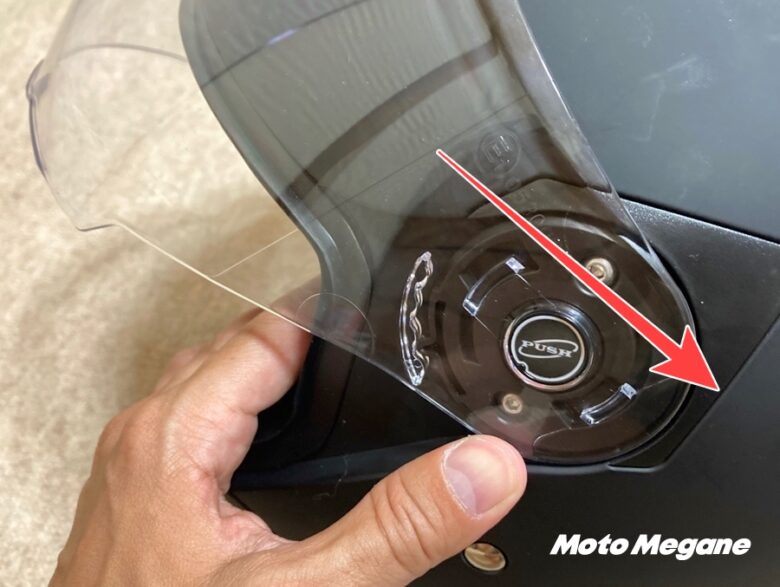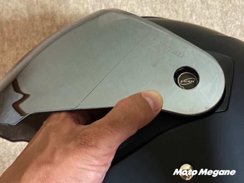ってことで、シールドを外す際は全開状態にした上で、左右の留め具の真ん中にある「PUSHボタン」を押しながら、シールドを斜め前に引き抜きます(左右別々に行います)