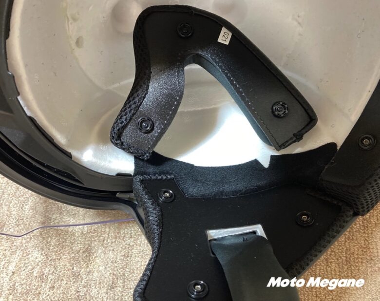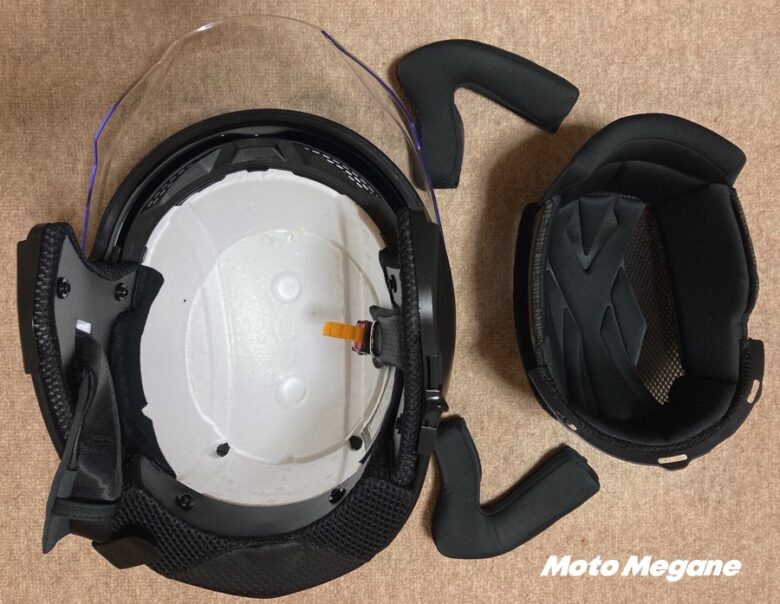 洗濯などでヘルメットの内装を外したい場合は、まずは左右のチークパッドを外す必要があります。