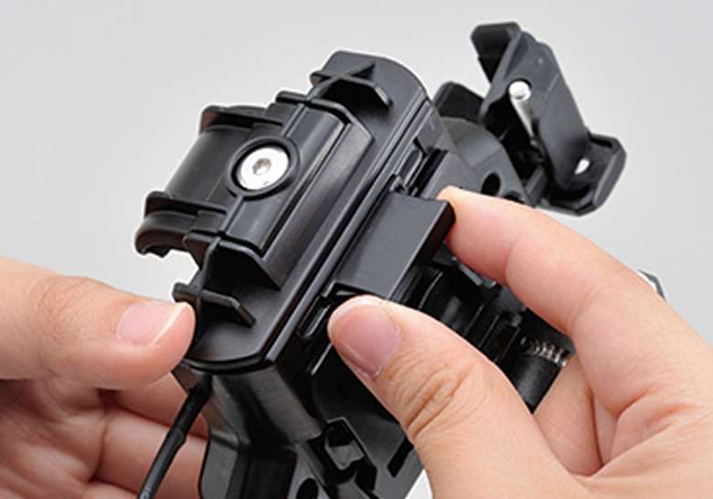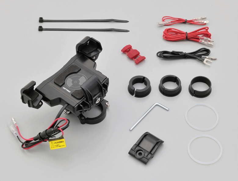 デイトナ社スマートフォンホルダー3のフォルムを継承したワイヤレス充電対応ホルダーだ。ホールドするだけで充電準備が完了し面倒なケーブルの抜き差しも不要。アルミ部品を使用することで、強固なホールド力を発揮。スライド調整や部品の組み換えにより、幅広い機種に対応する。