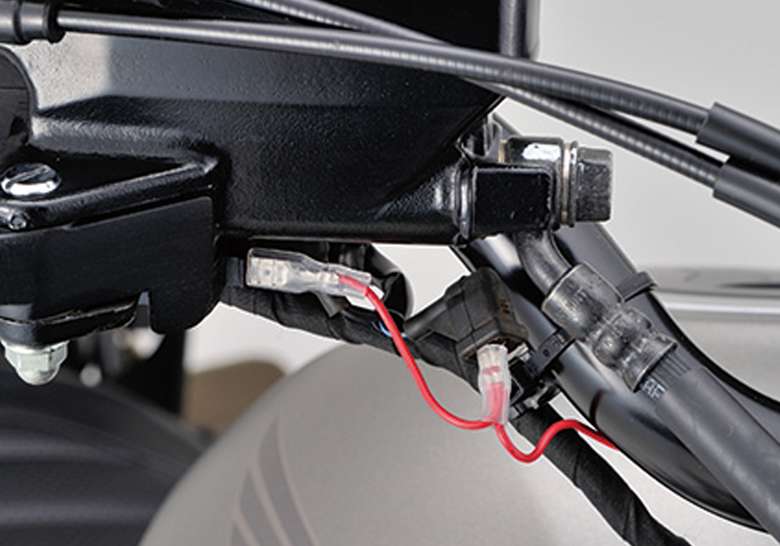 ブレーキスイッチとフレームのボルトに共締めするだけの簡単取り付け。メインキー連動でバッテリー上がりの心配もない。