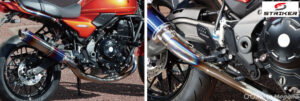 まずフルエキゾーストシステムだが、こちらはSTRIKERらしくスポーティーなスタイルに仕上げるため、ノーマルのダウンタイプレイアウトからアップタイプへと変更されている。