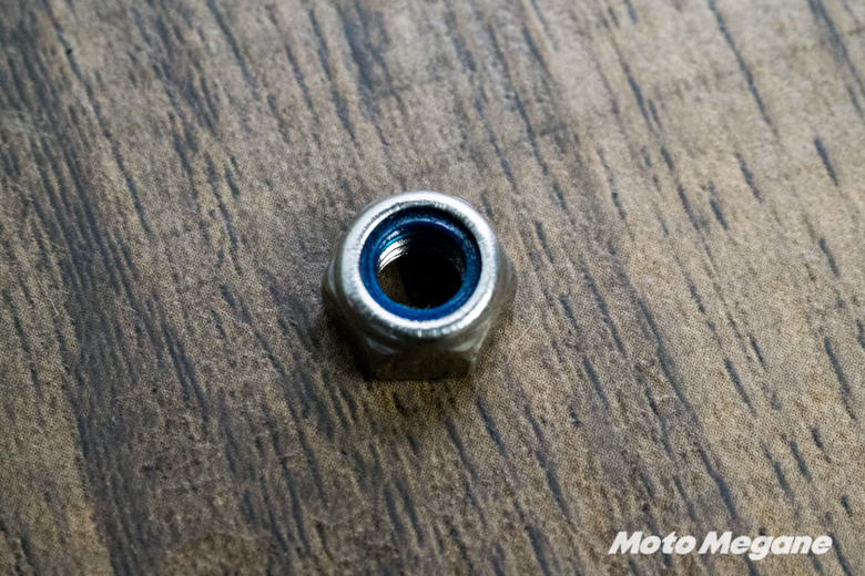 こちらは通常のナットに緩み止めの樹脂リングが付いているのが特徴で、通常のナットよりも緩める締める、どちらの際にも多少力が必要になる。