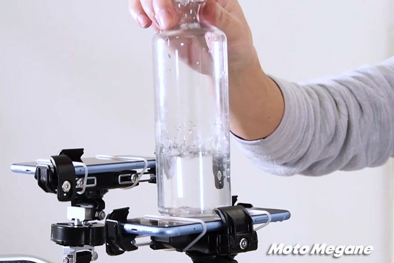 スマートフォンの上に水を入れたペットボトルを置いているが、ありの方は水の揺れが少なく、なしの方は大きく揺れているのがわかる。