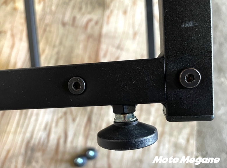 下部フレームが完成したら、地面と接地するグラつき防止アジャスターを4か所に取り付けます。