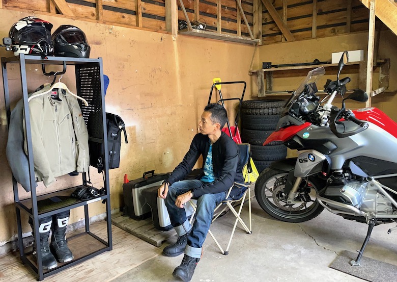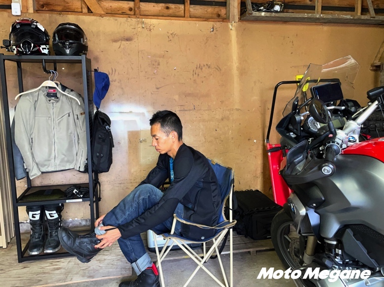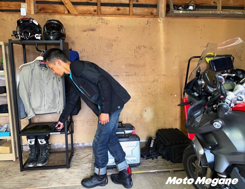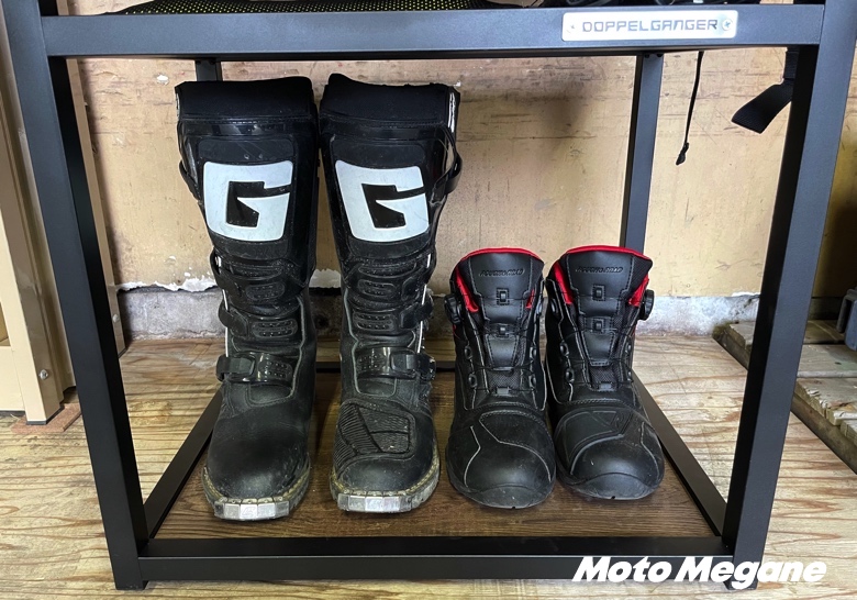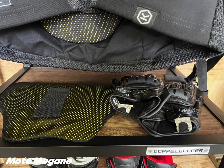 バイクに乗る時はヘルメットやジャケット、グローブやブーツなど身に着けるものがたくさんありますが、これらを別々の場所に置くと「あれはどこだっけ?これはどこだっけ?全然走り出せないやん、ぴえん、、、」ってな状況に陥りますが、これは全て同じ場所に収納できる優れものです。