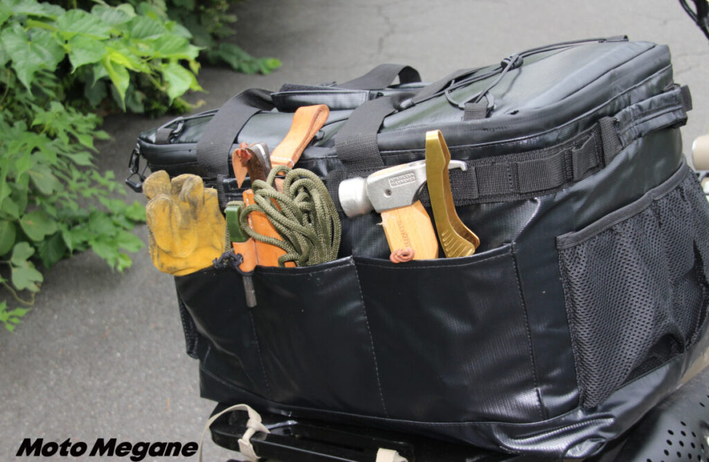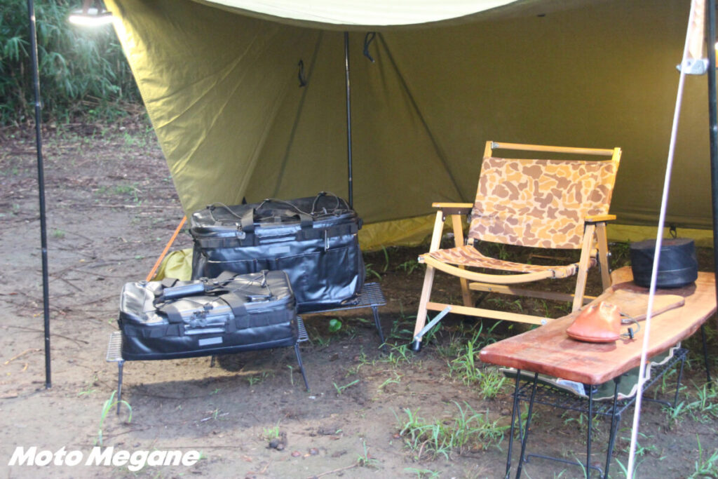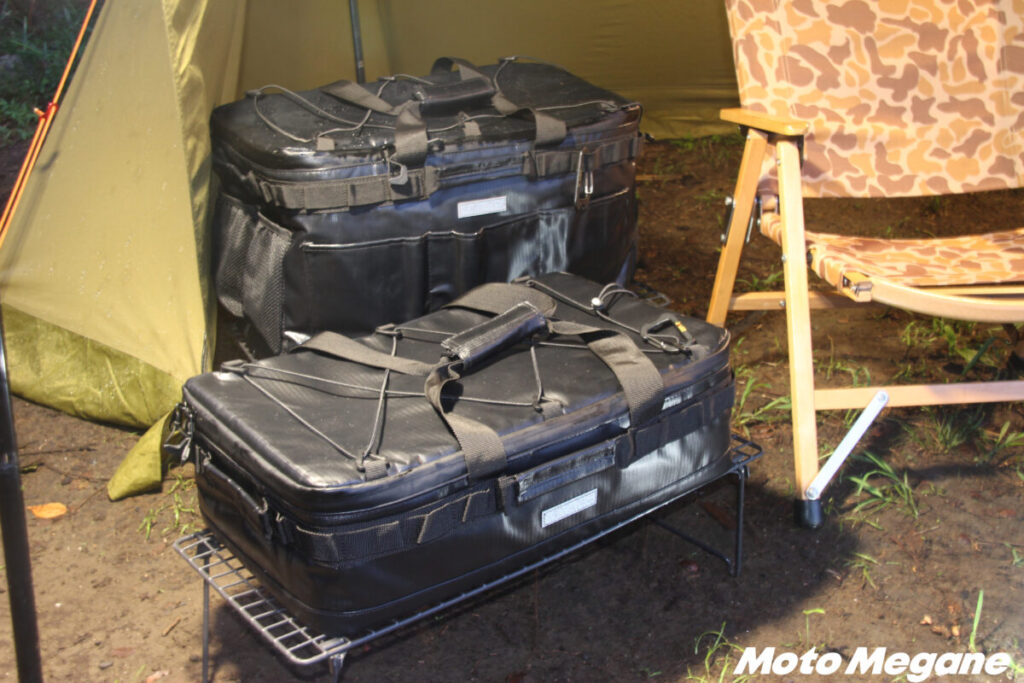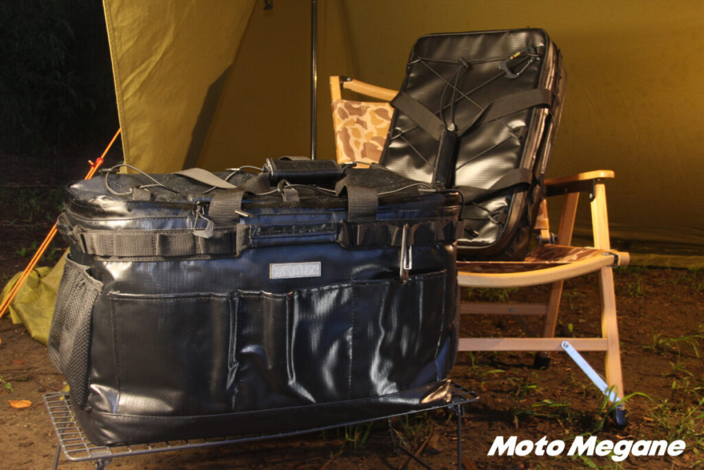キャンプギアには「ロマン枠」という言葉があり、これはたいして明るくないが、カッコいいから持って行くオイルランタンのような道具のことを指す。役にたたなくても眺めているだけで幸せにしてくれるギアのことだ。その点、このギアコンテナは眺めて良し、使って良し。バイクでも車でも機能性を発揮し、その上でキャンプ地で「映え」も担ってくれる一石何鳥?というアイテムと感じた。