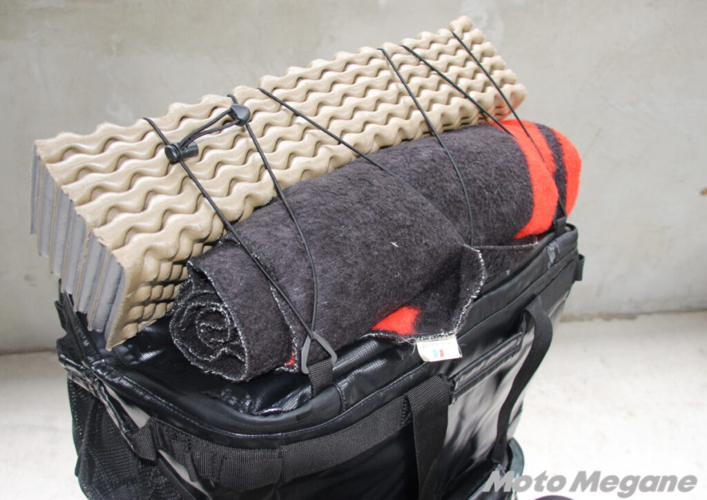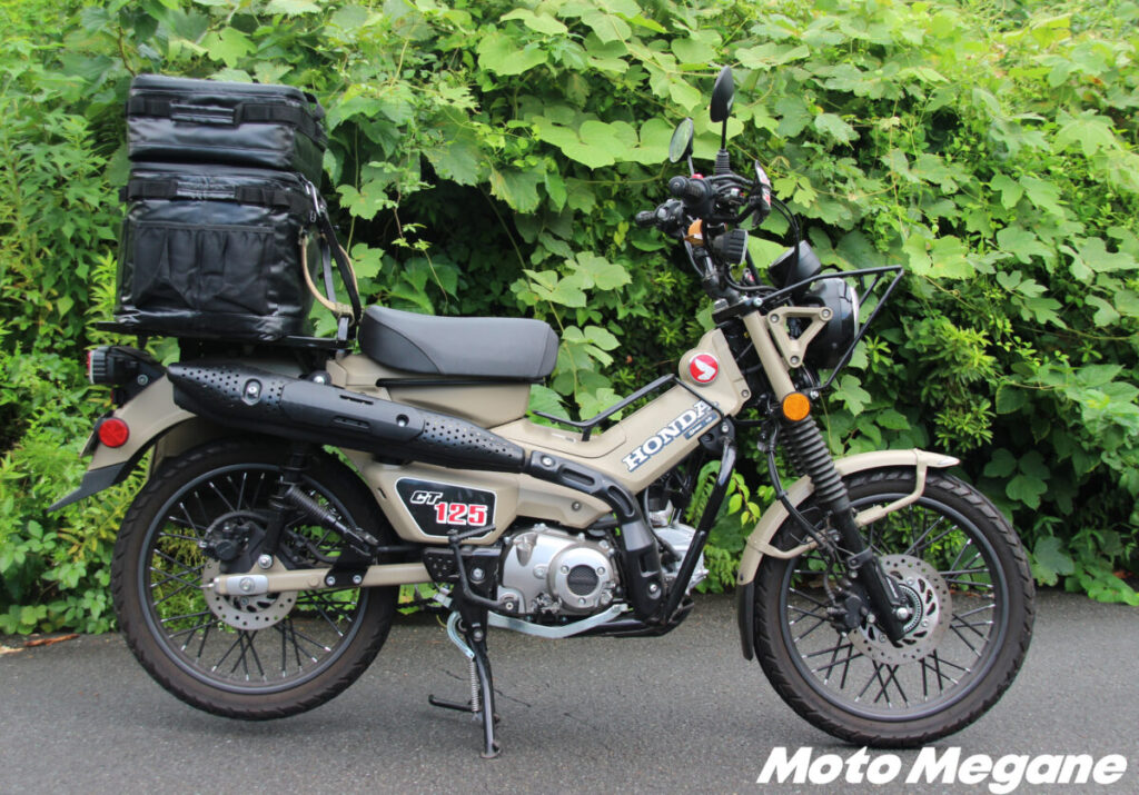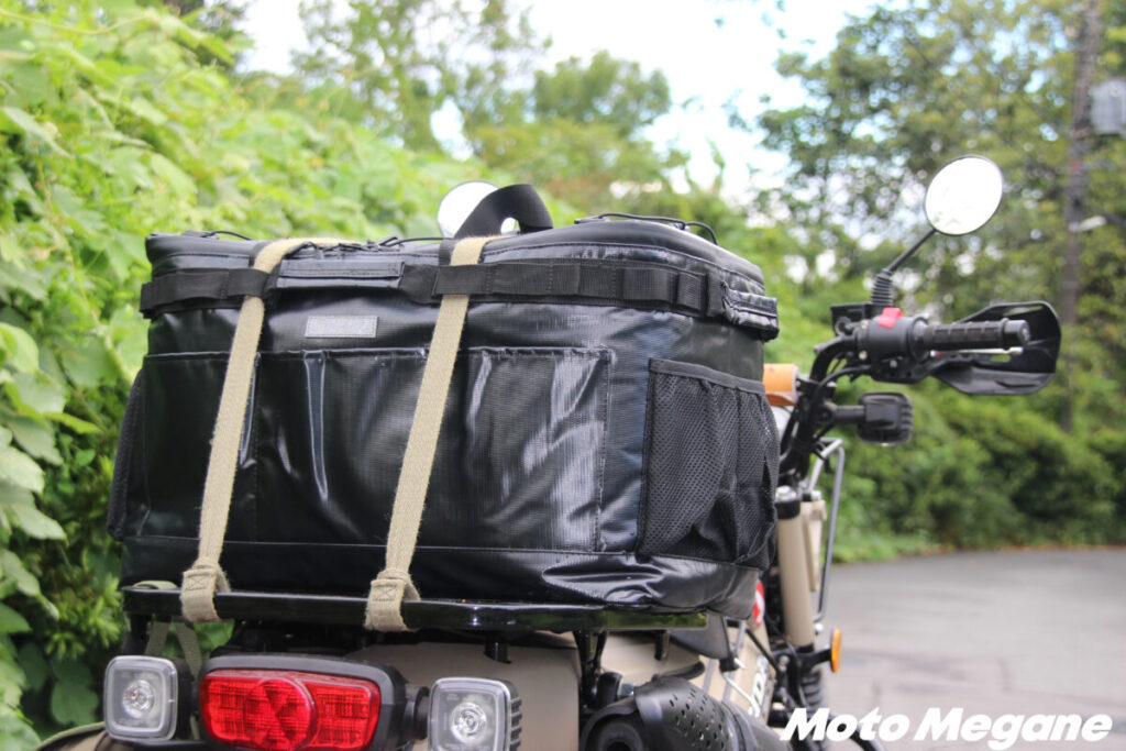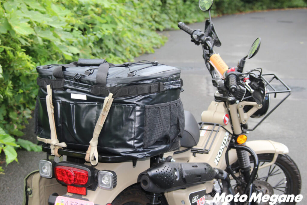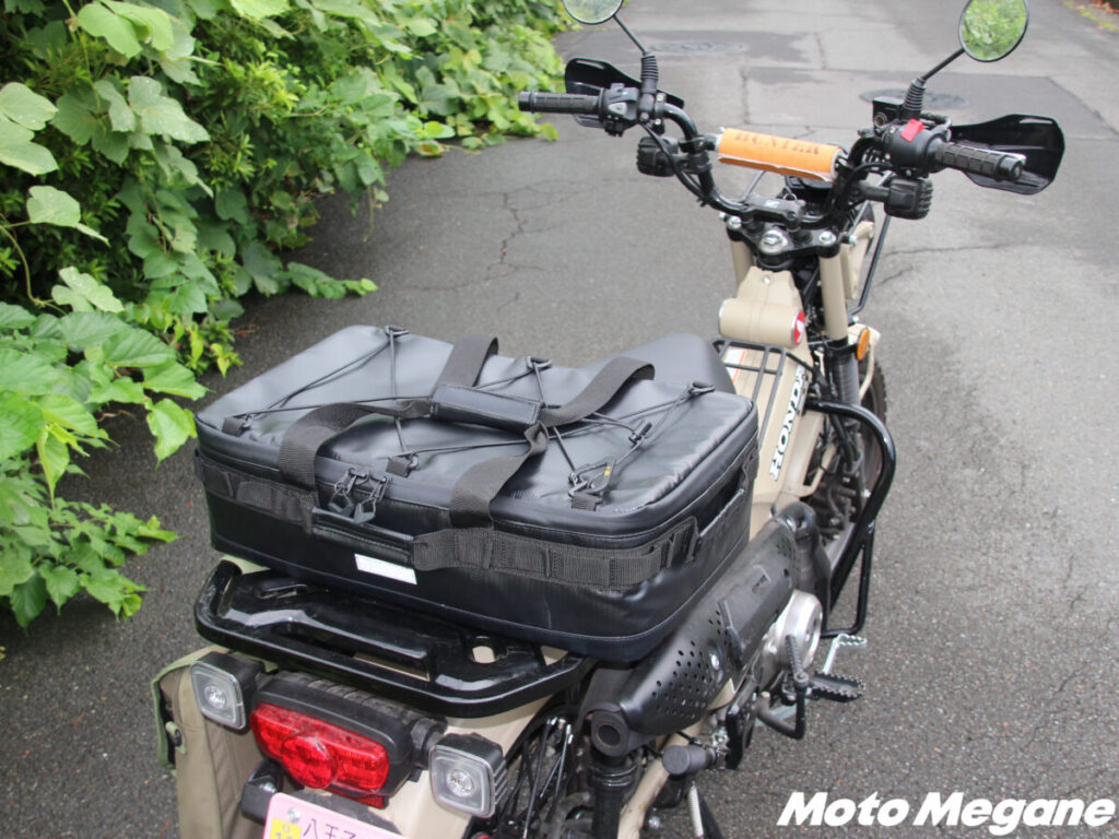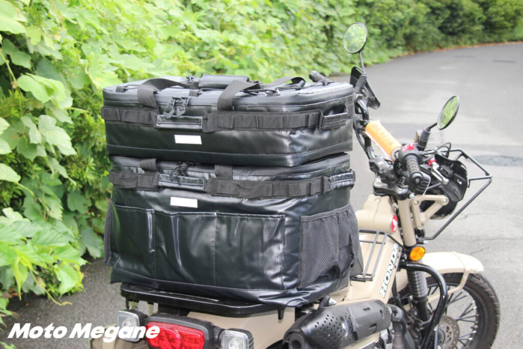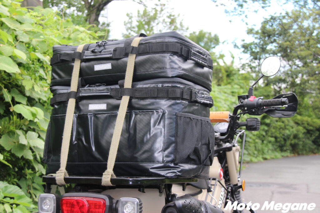 キャンプ道具を入れたままCT125ハンターカブのキャリアに積んでみると、これがほぼピッタリ。左右が3㎝ずつはみ出し、キャリアの後端は12㎝も余っているので、まだここに何か積める状態だ。そして固定も楽々。前述のデイジーチェーンに固定用のストラップを通すことで、ストラップの位置がズレず、荷物がしっかり安定する。一度ストラップを外し、Mの上にSを載せて、再び固定すると、これもばっちり固定できた。Mサイズ48L+Sサイズ22Lだから合計で70Lもの容量なのだが、非常にスマートでがっちり固定できたことには驚いた。