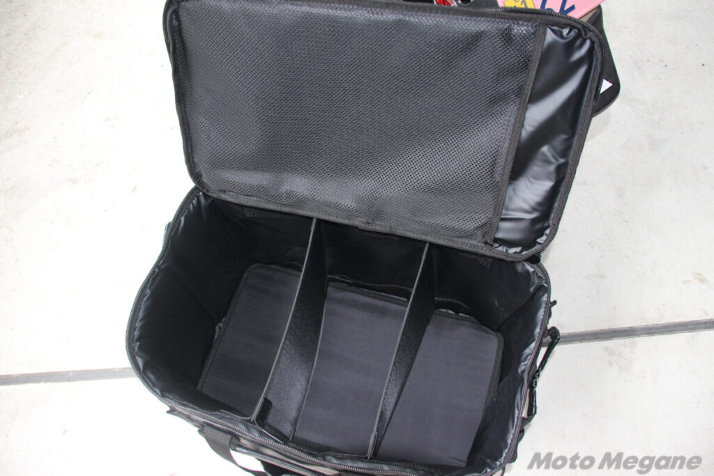 中を見てみると、2枚の仕切り板があり、荷物を小分けできるようになっている。この仕切りはマジックテープにより位置を変えたり着脱可能なので便利だ、また蓋の裏側にはメッシュポケットも装備。ここに保冷剤を入れておけば簡易的なクーラー(もちろん一時的な)としても使えそうだ。
