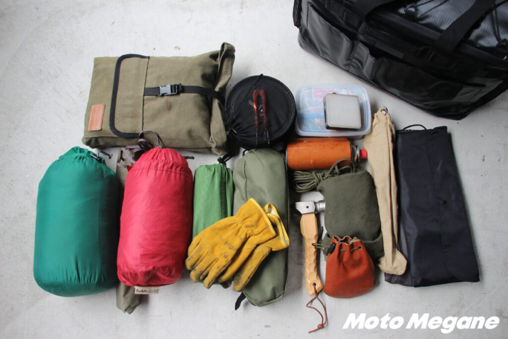 今回は筆者が普段使っているバイク用のソロキャンプグッズを用意して、Mサイズに入れてみた。テント、マット、椅子、ローテーブル2つ、寝袋、クッカー、カトラリー、焚き火台、LEDランタン、グローブ、ハンマー、ガスバーナー、調味料といった内容だ。Mサイズは容量48Lなので厳しいかと思ったが、これがすっぽり。どころか、まだ少し余裕がある状態だった。
